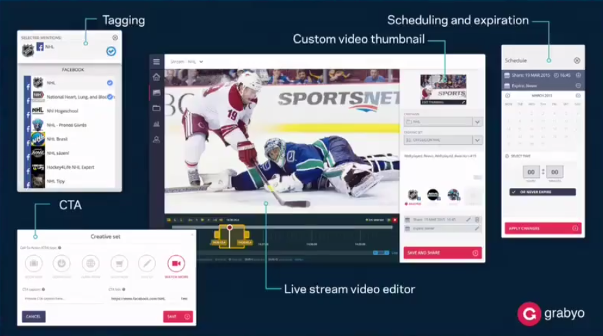 Tento tool nám umožňuje zpracovávat živý video stream v reálném čase na cloudu a pak z živého streamu uploadovat videa na Facebook. Nerozumíte? Příklad: Hraje se mistrovství světa v hokeji a díky Grabyo můžeme ty nejlepší momenty a góly rovnou uploadovat na facebookovou stránku.