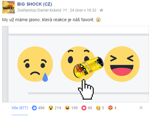 Ostatně demonstrujme si aktuální používání Reakcí na našem klientovi Big Shock! Sotva pár minut po zpřístupnění Reakcí českým uživatelům jsme nasadili příspěvek, v němž jsme publiku takřka napověděli, která Reakce by měla být „ta jejich“. Nová funkce byla tou dobou úplně čerstvá novinka a byli jsme tak zvědaví, jaké budou ve výsledku podíly jednotlivých Reakcí.
