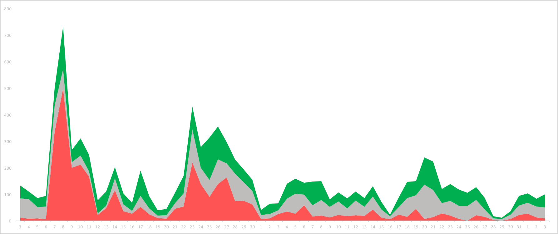 Vzal jsem data (komentáře, zprávy, reakce, zmínky, příspěvky na stránce) několika největších krizových komunikací nespojených s produktem, které jsme řešili, z roku 2015 a ze začátku roku 2016 (nebyli tehdy ještě reactions) a analyzoval je (cca 4500 příspěvků za období vždy 2 měsíců).
