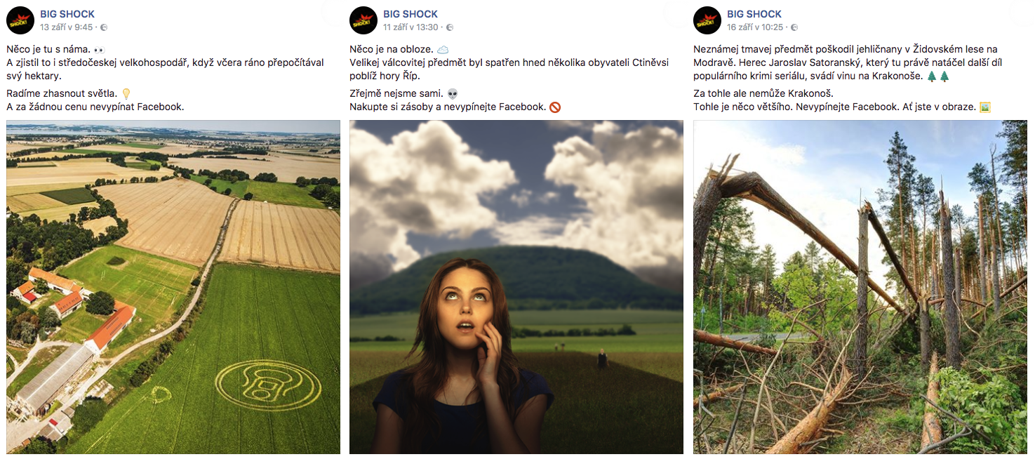 Týden před odhalením jsme rozjeli kampaň „Nevypínejte Facebook“. A po dlouhé době začali s přispíváním na denní bázi. Namíchali jsme naše oblíbené scény z filmů s tématikou ufo invaze, českým prostředím a obavami z neznáma.