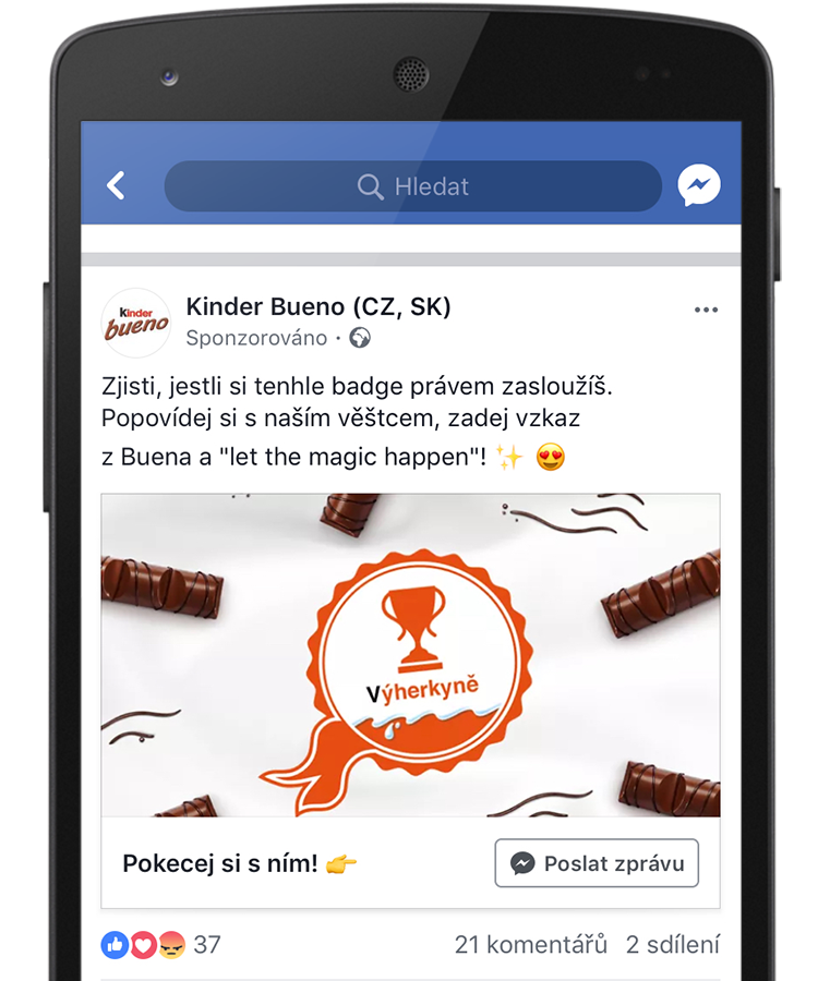 V Socialsharks jsme Messenger Ads použili hned u několika klientů, a taky jsme rychle zjistili, že ten hodnotný dárek, tu přidanou hodnotu může přinést například Messenger BOT. Ověřeno v podzimní kampani pro Kinder Bueno.
