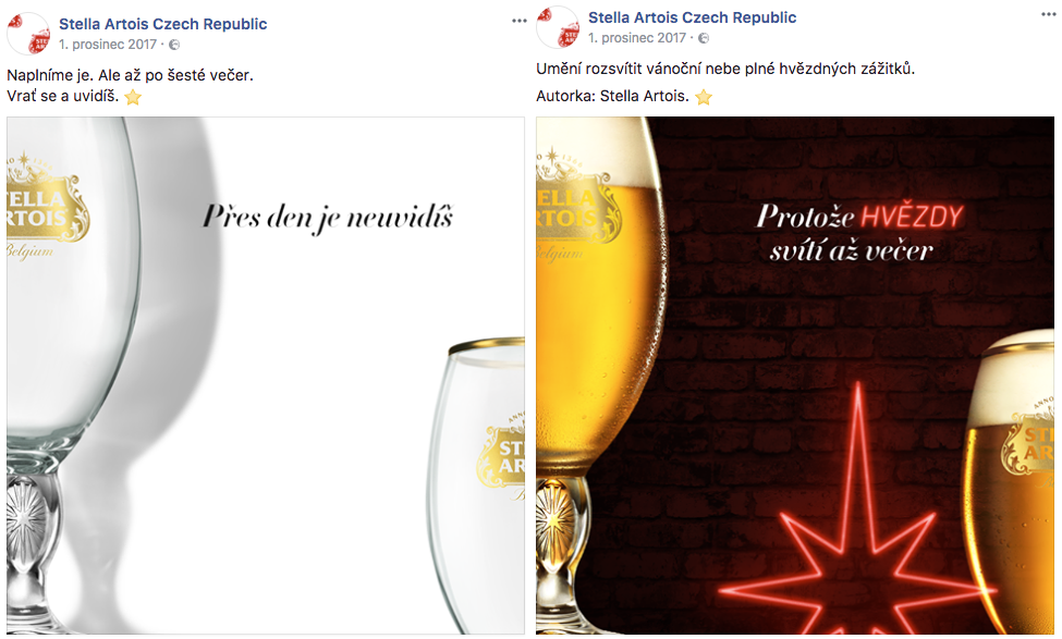 Během časového období 1. 12. 2017 – 23. 12. 2017 jsme potřebovali potenciálním konzumentům Stella Artois vrýt do paměti hned několik zásadních sdělení a pocitů. Kromě zřejmého svázání produktu s vánočními motivy, šlo i o propojení produktu Stella Artois s večerem. „Stella“ znamená v překladu „hvězda“, což nám vnuklo myšlenku spojit ji s motivem večera a noci, stejně jako si s večerem spojujeme samotné hvězdy. A zatímco tak řadu různých jiných piv nelze spojit s konkrétním denním obdobím, Stella Artois vynikne nejlépe, když je venku tma. Koneckonců přes den na nebi nesvítí hvězdy.