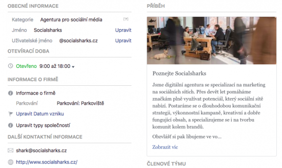 Takže do toho. Zkontrolutje již vyplněné info, kontakty, předmět podnikání a vůbec. A co je třešničkou na dortu? Rozhodně sekce „Příběh“ či „Our Story“, která má od loňska podobu pěkného Facebook Note, dobře viditelného na profilu Stránky.