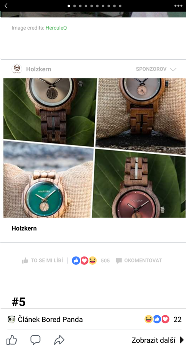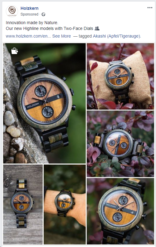 Abych trochu napravil reputaci Holzkern Ads teamu, musím zmínit i jejich fajn nápad – příspěvek vypadající jako album. Tento příspěvek nejen že ukazuje větší množství hezkých produktových fotek, ale taky lehce mate uživatele a nutí je ke kliknutí na obrázek. Potom už je na vás zaujaté uživatele remarketovat.